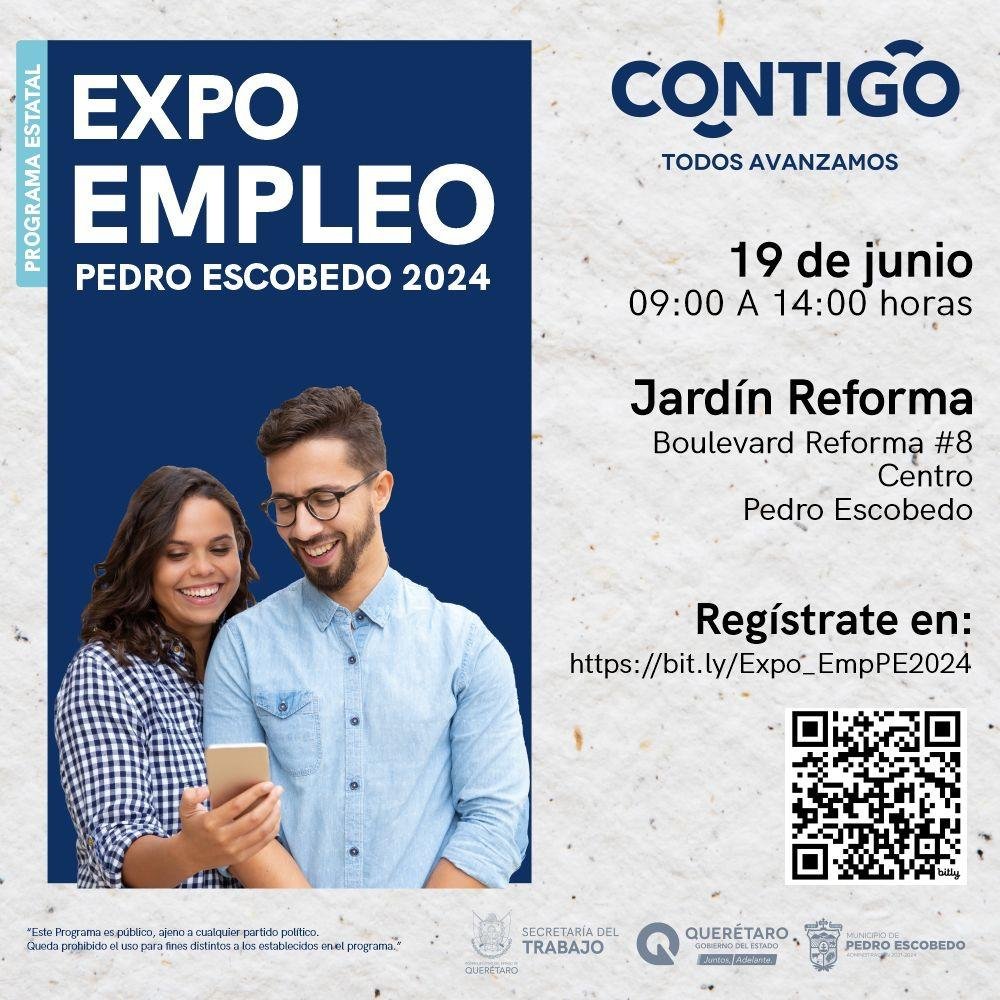 La Secretaría del Trabajo (ST), llevará a cabo la Expo Empleo Pedro Escobedo 2024, el próximo 19 de junio, en el Jardín Reforma, de 9:00 a 14:00 horas, en donde se promoverán mil vacantes en 33 empresas de la región de los sectores industrial y de servicios.